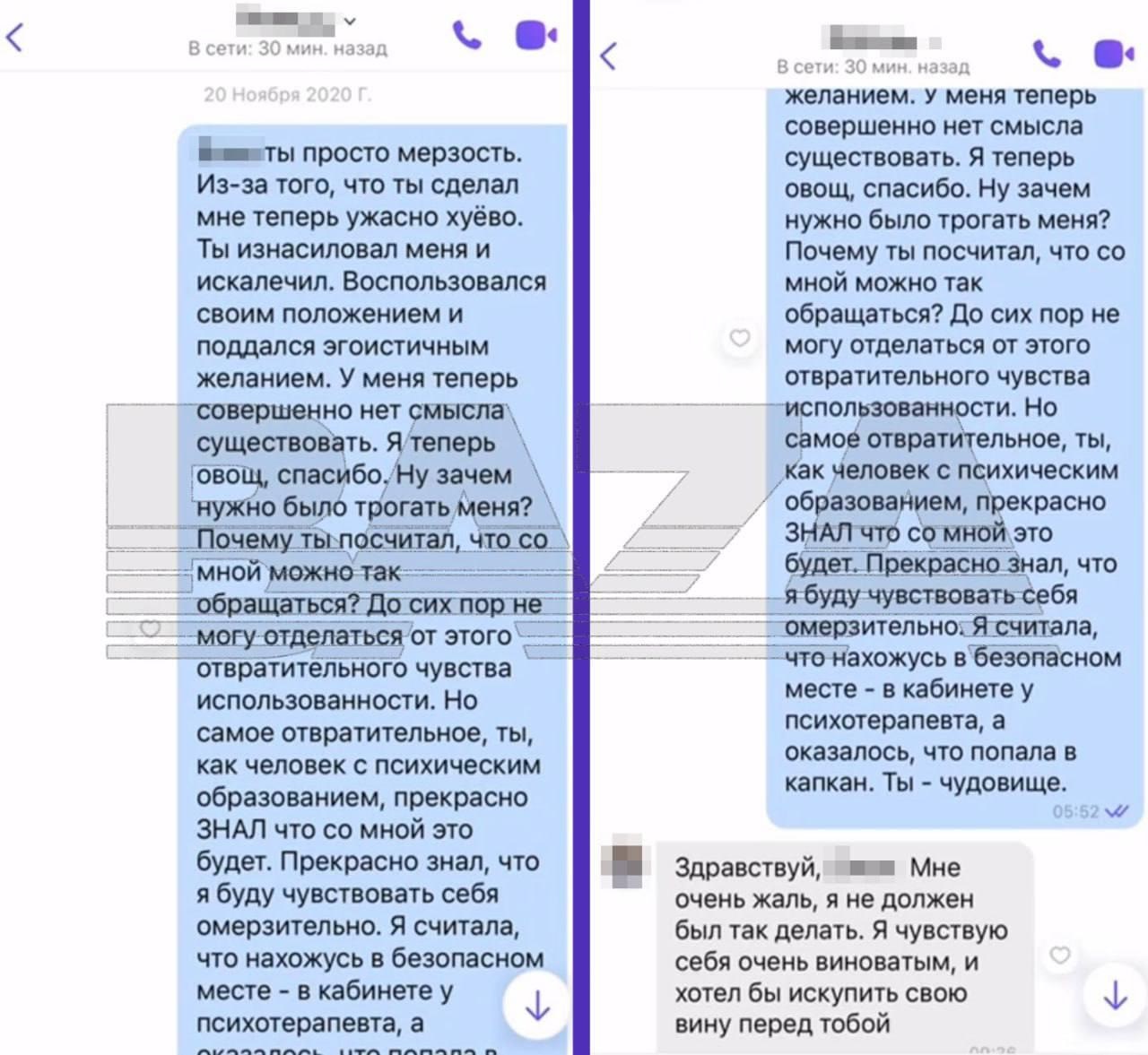 Охваченная страхом, Диана продолжила посещать сеансы. Девушка описывает последующие месяцы как череду унизительных эпизодов: вынужденные интимные переписки, повторяющиеся домогательства, а также психологические манипуляции. Врач, по ее словам, заставлял ее выражать восхищение его персоной и даже гладить его по голове, одновременно внушая чувство вины — будто бы она сама провоцировала подобное поведение.