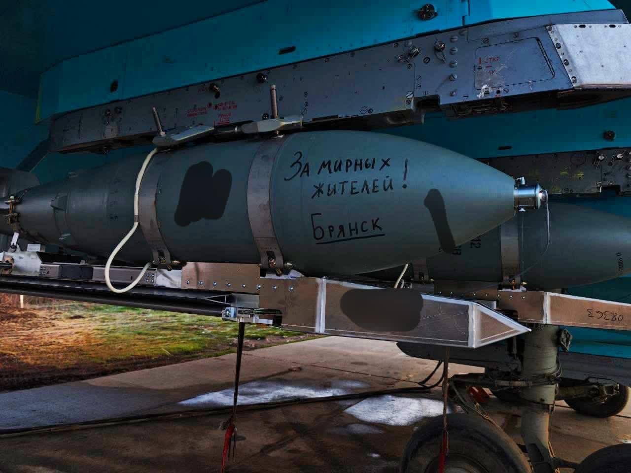 Сегодня, 17:21 РоссияРоссийские военные применили авиабомбы крупного калибра против объектов ВСУ. На корпусах части авиационных боеприпасов были нанесены надписи «За Брянск», «За каждого нашего — 1000 ваших» и «За мирных жителей!». Как сообщает Telegram-канал «Позывной Герань», опубликовавший соответствующие фотографии, речь идет о пятисоткилограммовых ФАБ-500, подвешенных на самолет Су-34 и оснащенных модулями планирования, что повышает их точность.